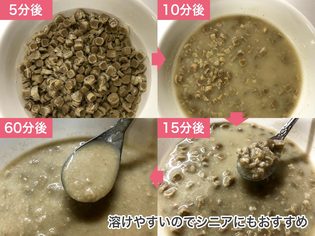 いつもの手作りご飯は柔らかかったのでそのままより何かかけた方がいいかなと思って、初めはお湯を少しかけてふやかしてみたらより食いつきがよくなりました。